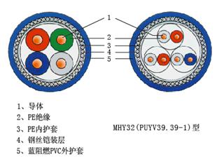 | MHY32(MHYV32、PUYV39、39-1、) | 煤礦用聚乙烯絕緣聚氯乙烯護(hù)套鋼絲鎧裝通信電纜 | 用于豎井或斜井作主信號(hào)傳輸能承受較大的拉力 |